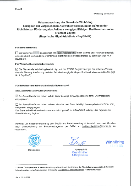 Die Gemeinde Winhöring führt zur Bestimmung eines Netzbetreibers, der mit einem öffentlichen Zuschuss den Aus-/Aufbau und Betrieb eines ultraschnellen NGA-Netzes realisieren kann, ein offenes, transparentes und diskriminierungsfreies einstufiges Auswahlverfahren aufgrund förderrechtlicher Vorgaben gemäß Nr. 7 der Richtlinie des Aufbaus von gigabitfähigen Breitbandnetzen im Freistaat Bayern (Bayerische Gigabitrichtlinie – BayGibitR) durch.