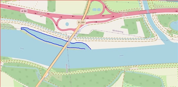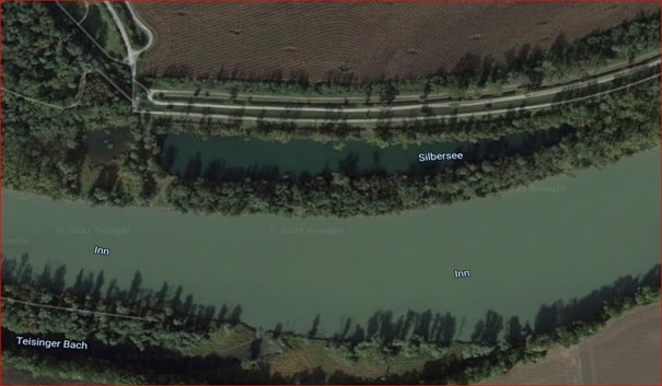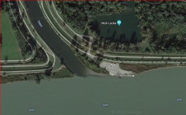 Die Isen knickt hier im rechten Winkel ab und strebt eingedeicht auf den Inn zu. Vor über hundert Jahren ergoss sie sich in einem breiten Delta unterhalb des Inn-E-Werks in den Inn.