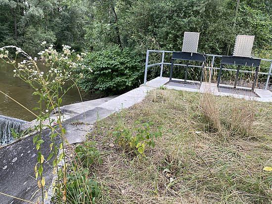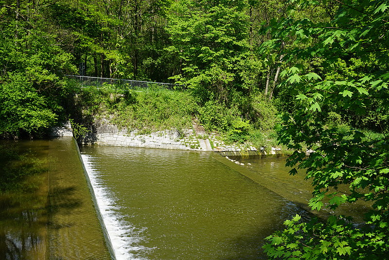 Flussaufwärts gesehen donnert die Isen über einen die gesamte Flussbreite überspannenden, ca. 4 m hohen, künstlich geschaffenen Wasserfall. Wer Geduld aufbringt und genau hinschaut, der entdeckt vielleicht die Wasseramsel, wenn sie hinter dem Schleier des herabfallenden Wassers zu ihrem Nest fliegt. Schon seit vielen Jahren baut sie an dieser uneinsichtigen Stelle ihr Nest.