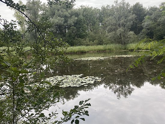 0,3 ha klein wirkt der Weiher aus der Luft gesehen wie das i-Tüpfelchen auf dem Silbersee. Das vom Inn isolierte Altwasser ist nur an einer Stelle zugänglich, ansonsten von Gestrüpp, hohen alten Bäumen und Schilf umstanden. Im Sommer zieht er die Blicke auf seinen Seerosenbestand.