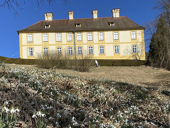 Auf der kleinen Streuobstwiese wachsen diverse Obstbäume, die Kenner können die Obstbaumart auch schon vor dem Tragen der Früchte identifizieren. Ansonsten bietet sich der Herbst an um beim Verkosten der Früchte herauszufinden, welcher Obstbaum sich hier entfalten darf. Ein wunderschöner Weg führt rechter Hand an der Streuobstwiese vorbei. Neben der Obstbaumblüte verzaubert den Wanderer der Hang unterhalb des Schlosses mit seiner Blütenpracht an Frühlingsblühern.