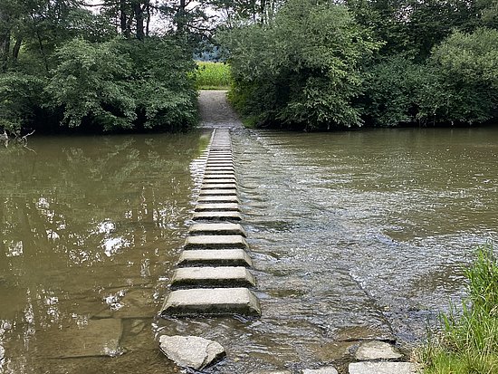 Mit etwas Fantasie sieht sich der Betrachter in der Aneinanderreihung der Trittsteine an die Rippchen einer Schokolade erinnert. Ein Ort mit Ausstrahlung: Stell dich in die Mitte des Flusses und lass deinen Blick die Isen flussauf- und flussabwärts wandern. Mit seinen wilden Ufersäumen links und rechts einerseits und andererseits der Vorstellung des über die Dükerverbauung stürzenden Wassers. Von hier aus ist es knapp ein Kilometer Fußweg bis zum Isen-Stausee.